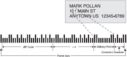 ZIP+4 code (52 bars), or an eleven-digit delivery point code (62 bars).