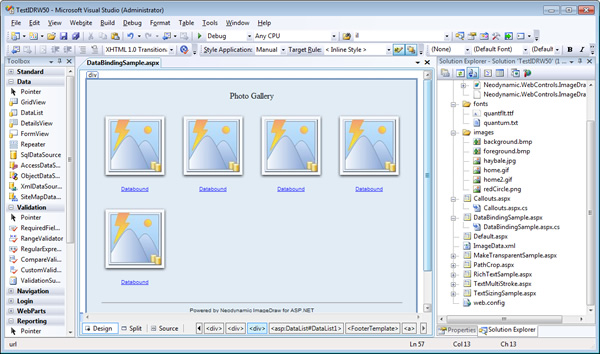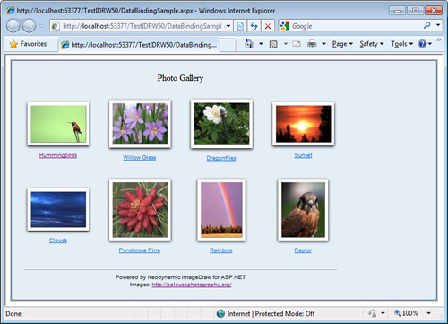 The following sample uses ImageDraw control to render remote image files - specified by URLs – to create a Photo Gallery page using an ASP.NET DataList control.Image URLs are stored in an XML file and ImageDraw is used to dynamically create sophisticated image effects manipulating the original image files.